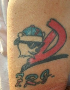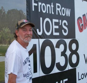 evening game. Surviving the sweltering heat, a man sits along the 3rd baseline in a front row box seat with a personal name tag attached to the back of it that reads, “Joe Rowe”.